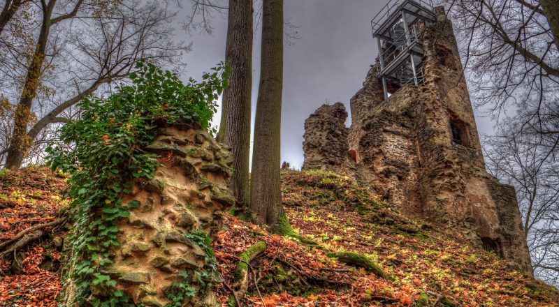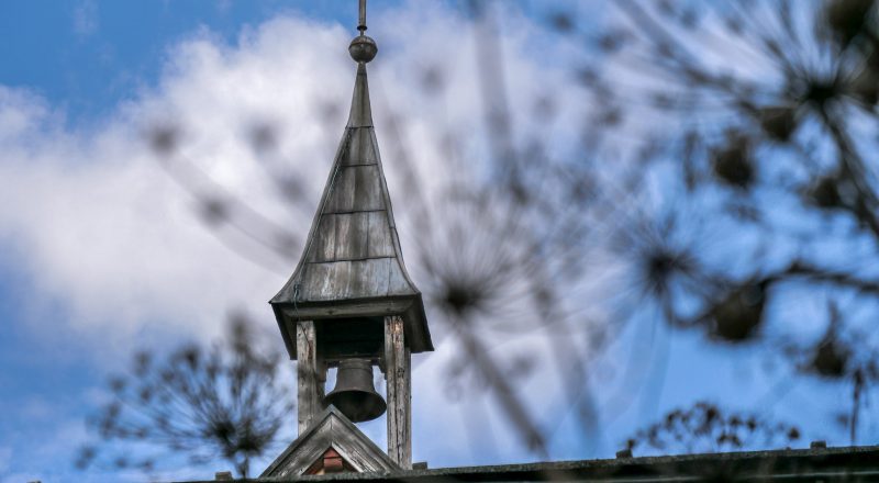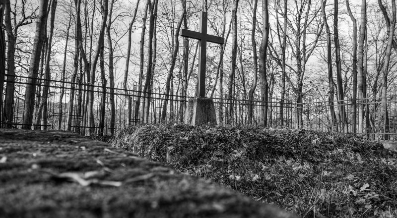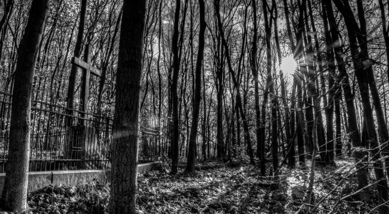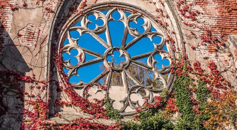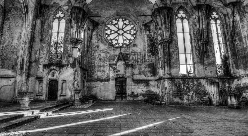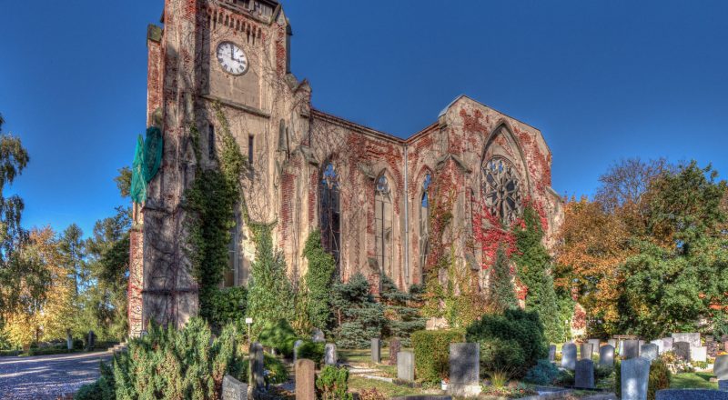 • Die kleine Kirchenruine auf dem verlassenen Friedhof
